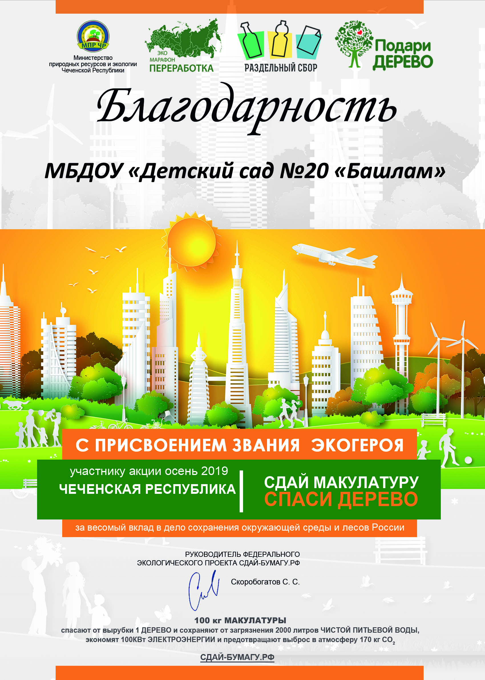 С присвоением звания экогероя МБДОУ "Детский сад №20 "Башлам" за весомый вклад в дело сохранения и окружающей среды и лесов России.