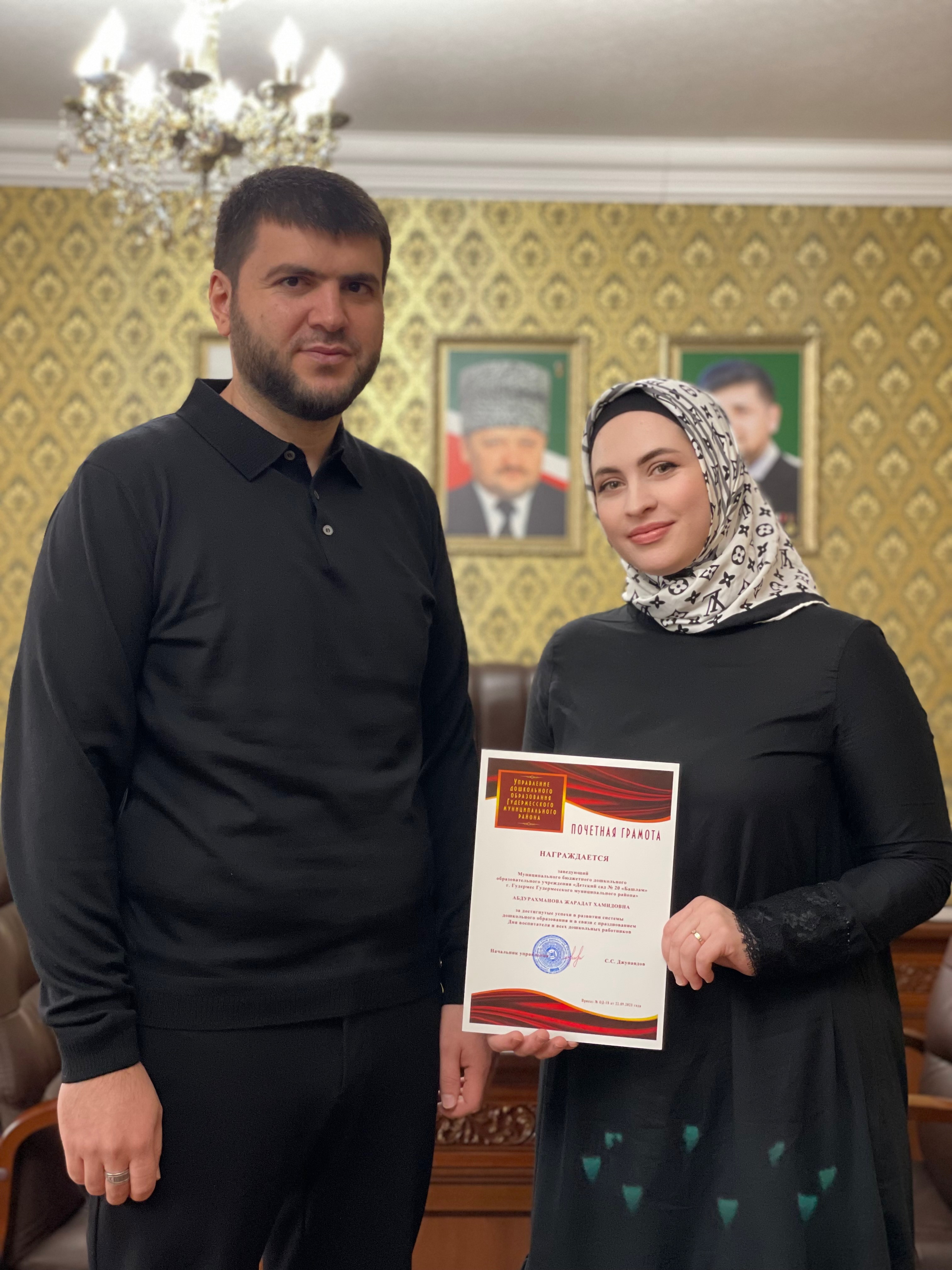 22.09.2023Заведующий, Абдурахманова Ж.Х. была награждена почетной грамотой МУ "УДО Гудермесского муниципального района" за достигнутые успехи в развитии дошкольного образования и в связи с празднование Дня воспитателя и всех дошкольных работников